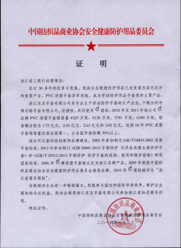 东亚手套获浙江名牌产品证书